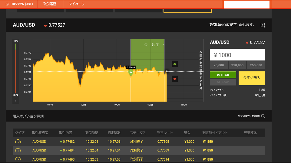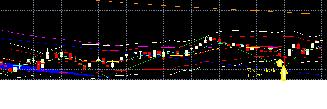 上位足と下位足が共に上昇のパーフェクト―オーダーが成立しているのであれば、下位の足の方でhighに賭けるようにすれば勝率が高くなるわけです。