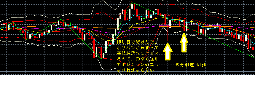 賭けた分には問題ないですが、賭けた後の事を考えると、高値が更新せずにボリバンが狭まってきたので、FXでは損切を考慮しないといけない。