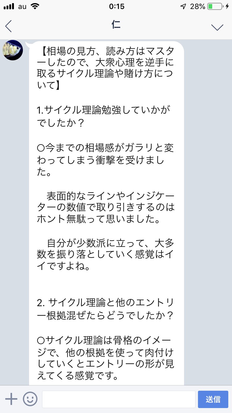 相場の読み方、考え方をマスターしてもらった後に、大衆心理を逆手に取る方法や、サイクル理論、賭け方を教えて自分のものにしてもらったときの感想です!